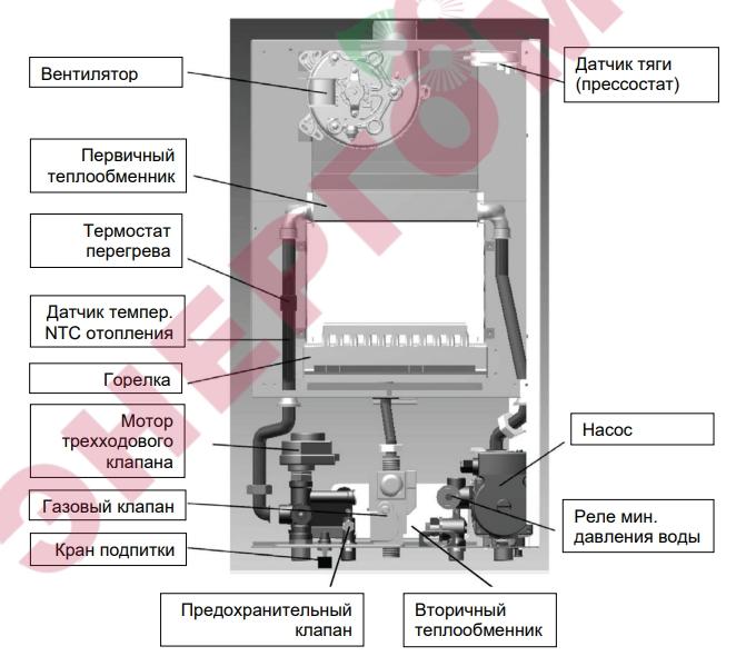 • Первичный теплообменник медный, теплообменник ГВС из нержавейки;